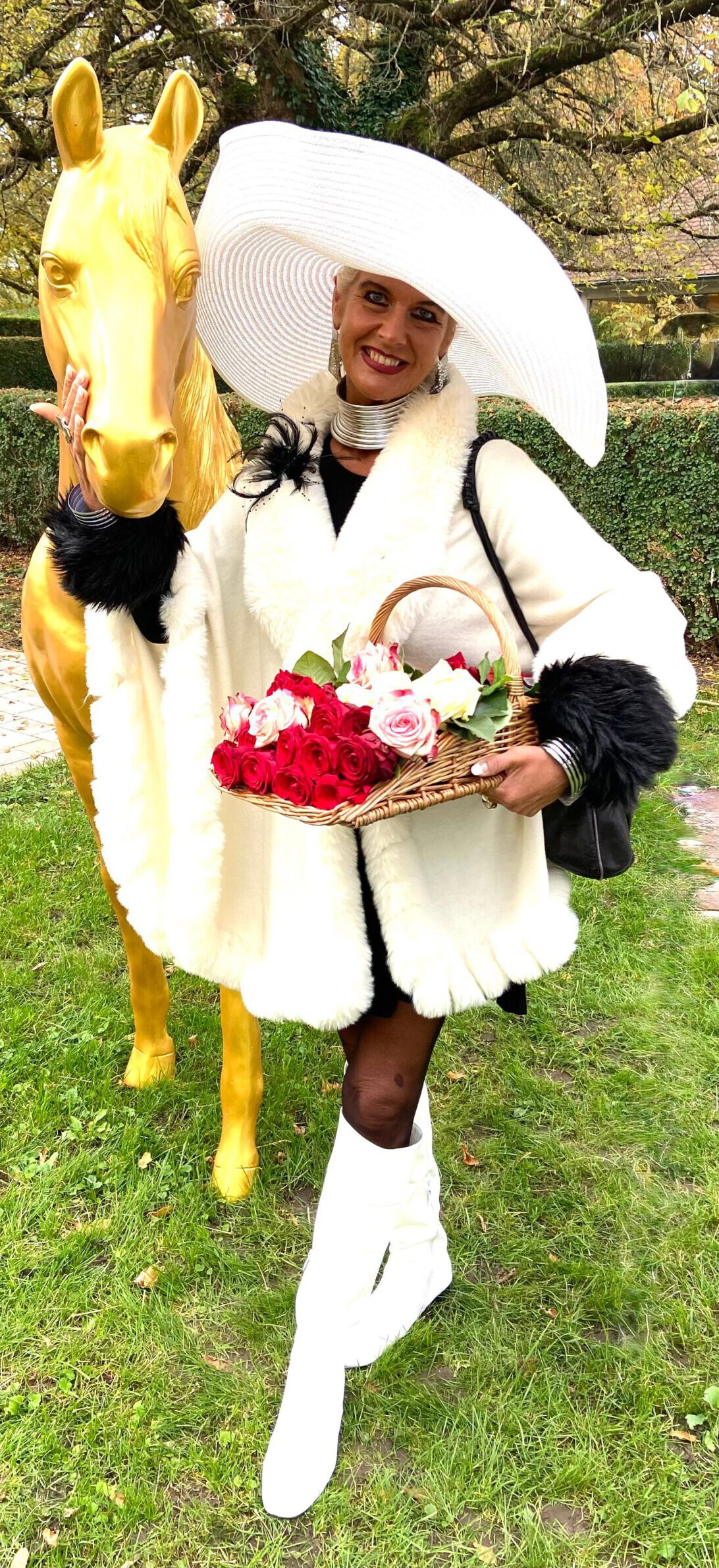 Immer schon war sie nach eigener Aussage vom Glamour fasziniert. Im Gespräch fallen hier Vorbilder wie Marilyn Monroe und Audrey Hepburn. Aber auch die schiere Zahl ihrer extravaganten Hüte (deren Zahl sie mit fünfzehn angibt) sorgt dafür, dass sie mit ihrem ausgefallenen Äußeren draußen auf der Rennbahn, aber auch in der Innenstadt für Eleganz steht, für Lebensart. Wie eine Botin aus leider vergangener Zeit. Hier ist man versucht, so etwas Niveau zu nennen, wenn sie dem Publikum mit ihren ihren anmutig drapierten langstieligen Rosen zeigt, dass so ein Auftritt in seiner etwas gehobenen Form durchaus noch zeitgemäß sein kann.